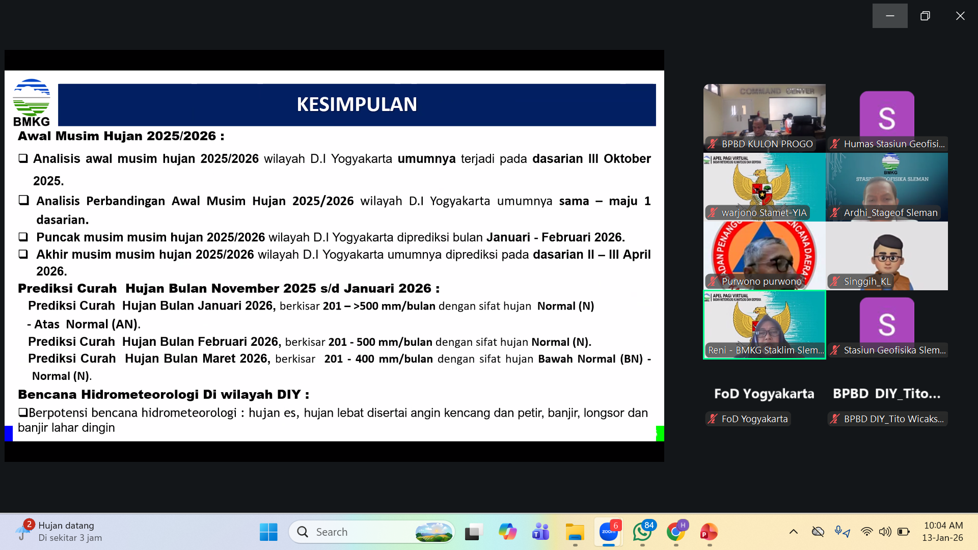 Yogyakarta, 13 Januari 2026 – Badan Meteorologi, Klimatologi, dan Geofisika (BMKG) Daerah Istimewa Yogyakarta mengeluarkan peringatan dini terkait potensi cuaca ekstrem yang diprediksi akan melanda wilayah DIY selama sepekan ke depan. Hal tersebut disampaikan dalam agenda Rapat Koordinasi dan Konferensi Pers Bersama BPBD, awak media, dan stakeholder terkait.